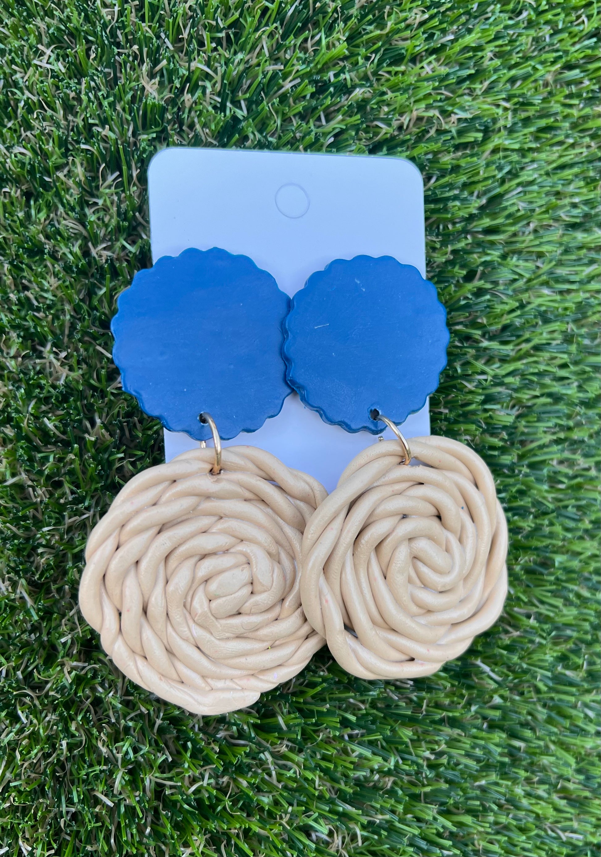 Dizzy features a neutral design created by hand, featuring twists and a coil that imitates a raffeta appearance. No two pieces are ever alike!