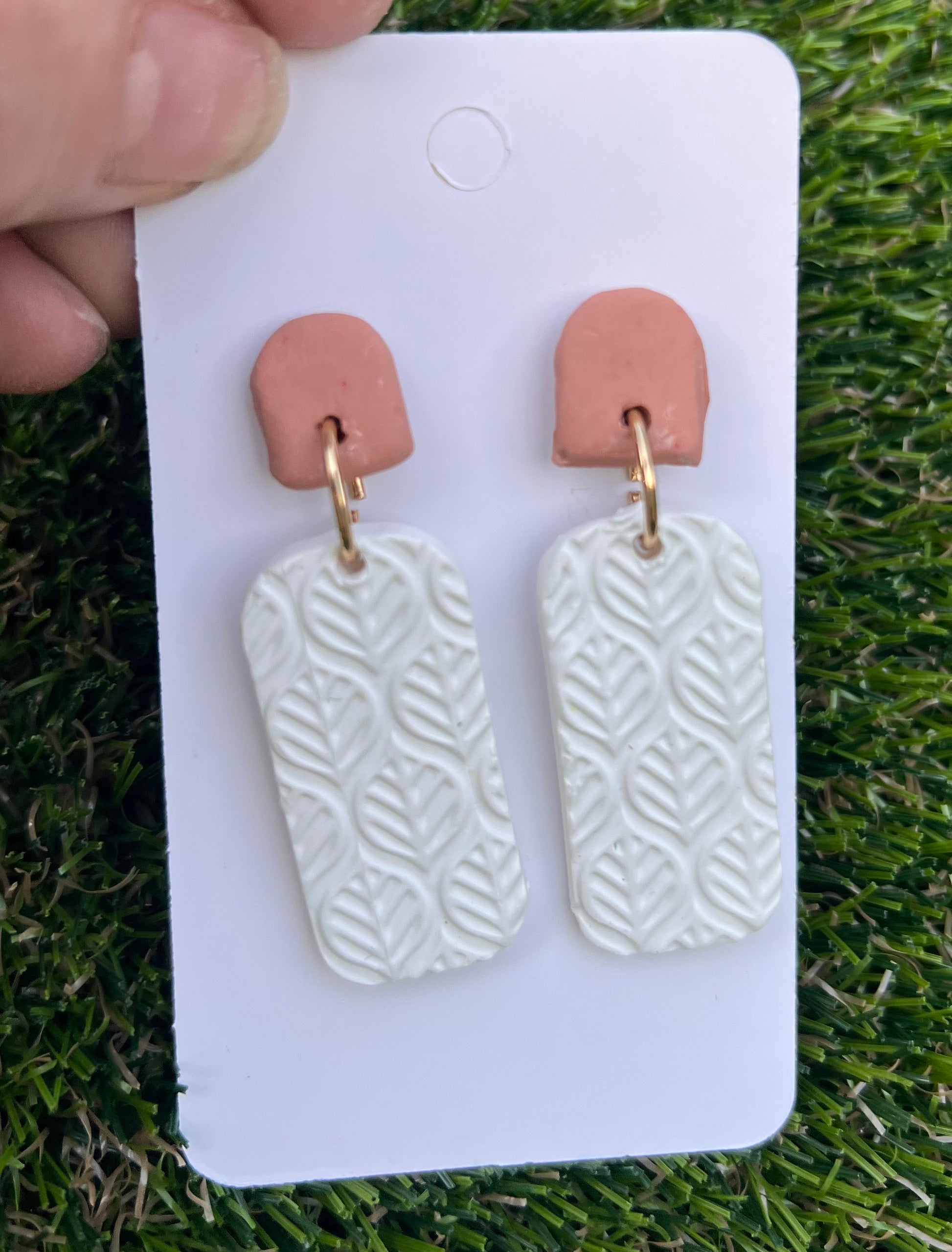 A neutral design featuring leaves imprinted on a pearl white with a clayish pink button. These are perfect for work or running errands.